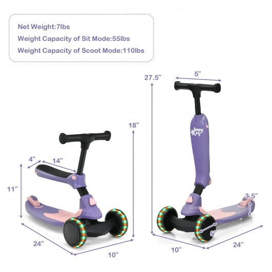 2 in 1 Kids Kick Scooter with Flash Wheels for Girls Boys from 1.5 to 6 Years Old-Purple
