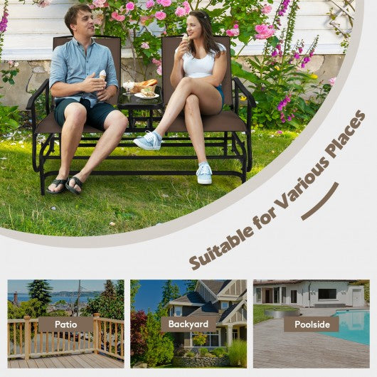 2-Person Double Rocking Loveseat with Mesh Fabric and Center Tempered Glass Table-Brown