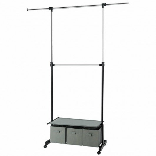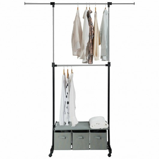 2-Rod Adjustable Garment Rack with Shelf and Storage Boxes