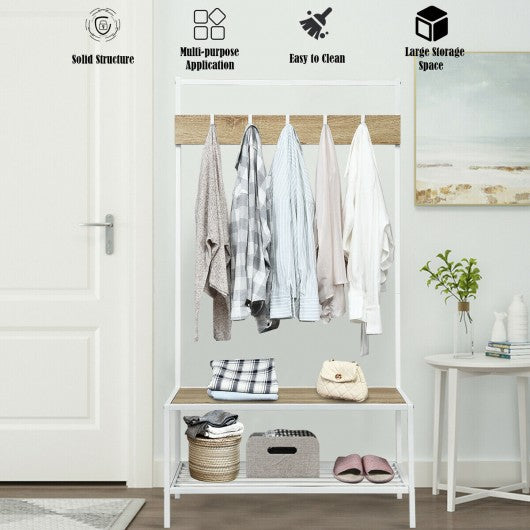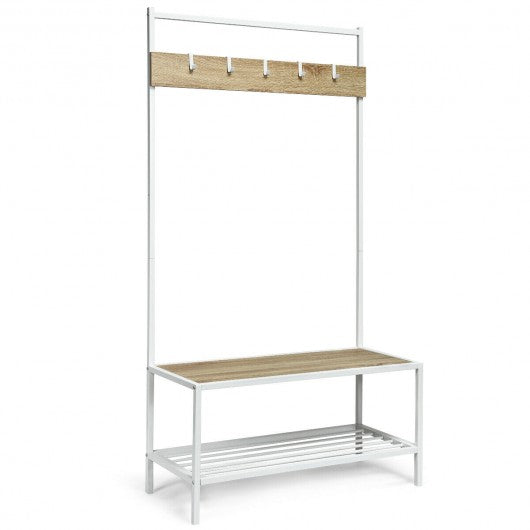 3 in 1 Industrial Coat Rack with 2-tier Storage Bench and 5 Hooks-Natural
