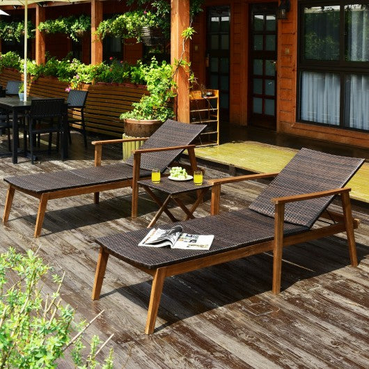 3 Pcs Patio Wooden Frame Rattan Lounge Chaise Chair Set with Folding Table