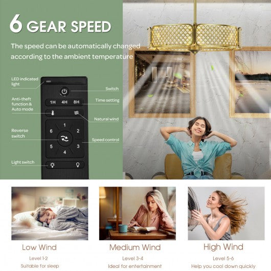 30 Inch Caged Ceiling Fan With Light Crystal Lampshade 6 Light Bases-Golden