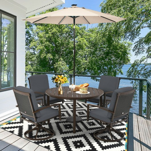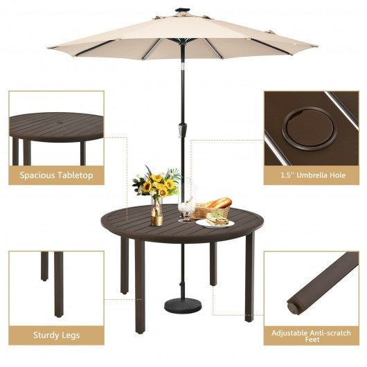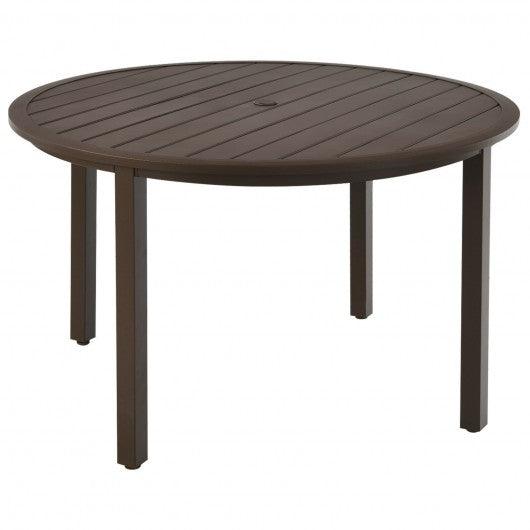 49 Inch Round Patio Dining Table Metal Slatted Table with Umbrella Hole-Brown