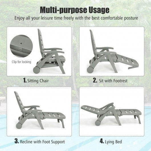 5 Position Adjustable Folding Lounger Chaise Chair on Wheels-Gray