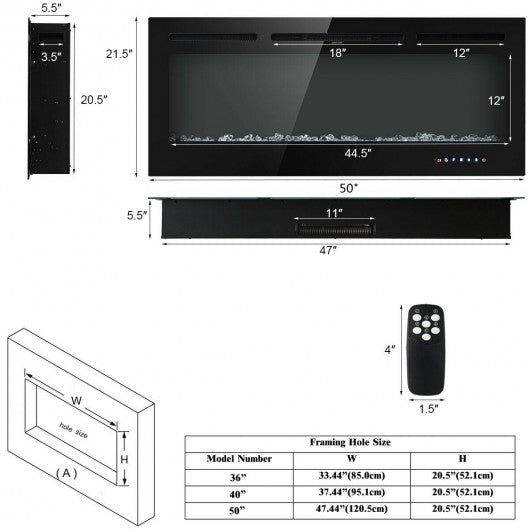 50 inch Recessed Electric Insert Wall Mounted Fireplace with Adjustable Brightness