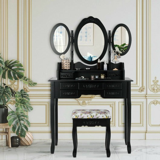 7 Drawer Tri-Folding Mirror Dressing Vanity Makeup Set-Black