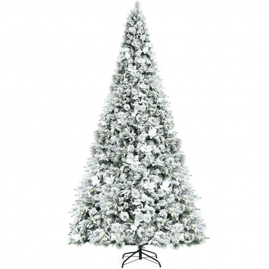 8 Feet Snow Flocked Hinged Christmas Tree with Berries and Poinsettia Flowers
