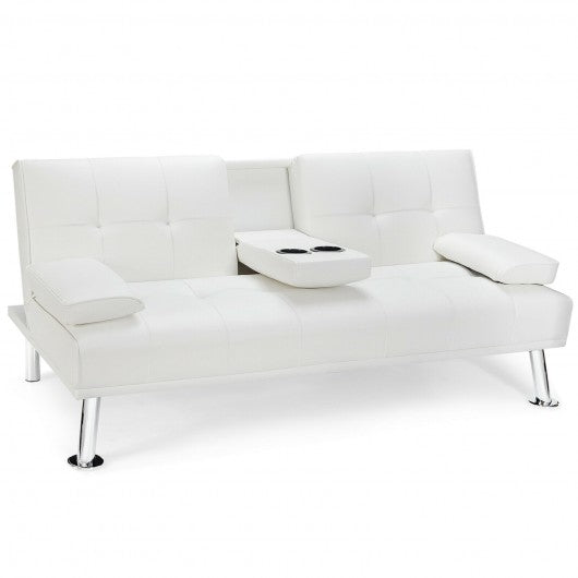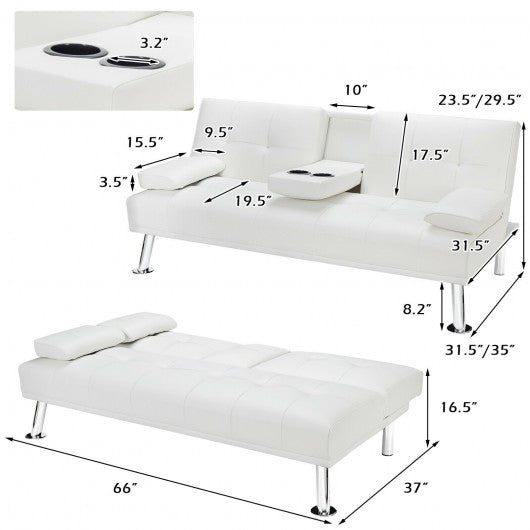 Convertible Folding Leather Futon Sofa with Cup Holders and Armrests-White