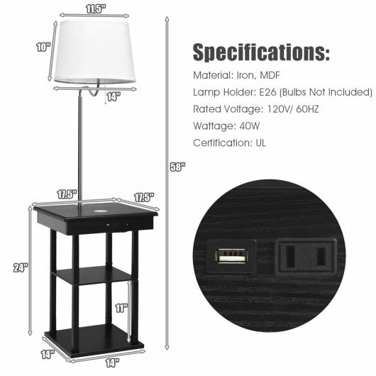 Floor Lamp Bedside Desk with USB Charging Ports Shelves-White