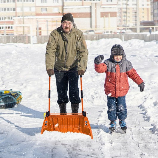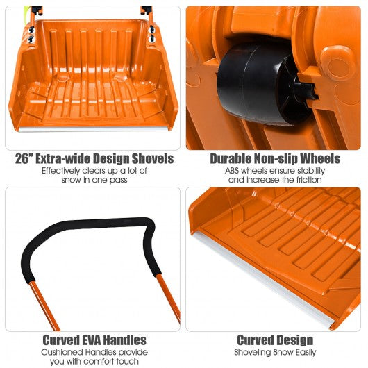 Folding Snow Pusher Scoop Shovel with Wheels and Handle-Orange