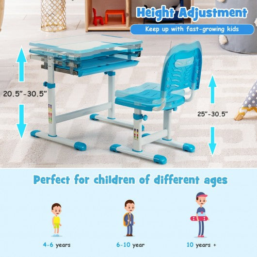 Kids Height Adjustable Desk and Chair Set with Tilted Tabletop and Drawer-Blue