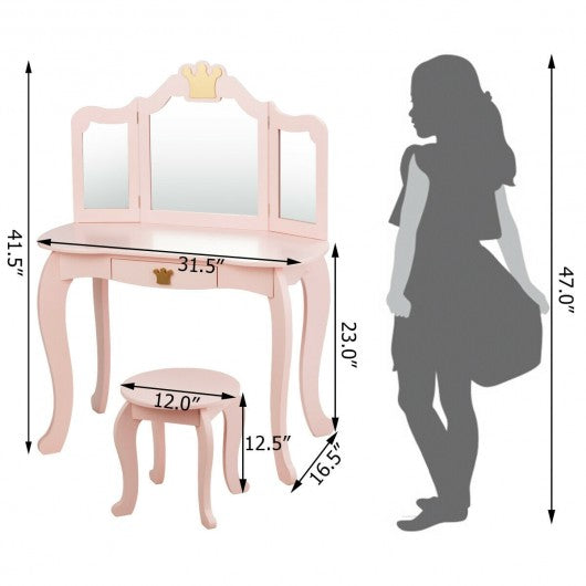 Kids Makeup Dressing Table with Tri-folding Mirror and Stool-Pink