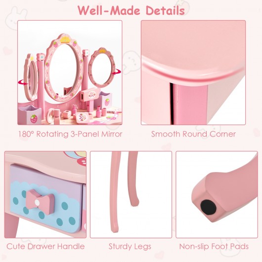 Kids Vanity Princess Makeup Dressing Table Chair Set with Tri-fold Mirror-Pink