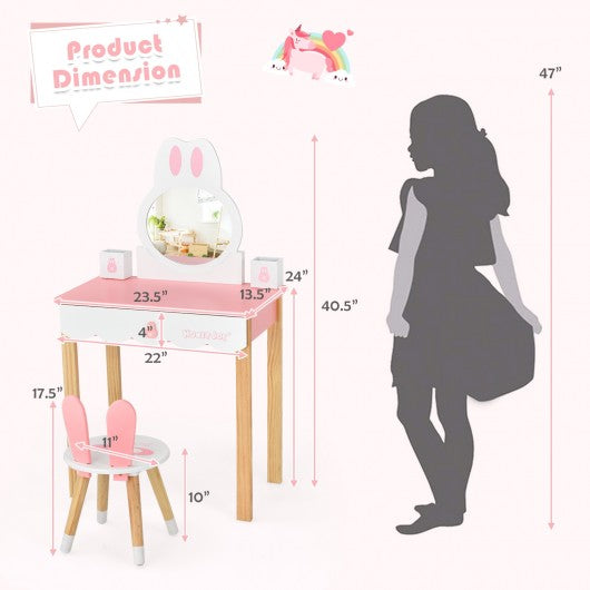Kids Vanity Set Rabbit Makeup Dressing Table Chair Set with Mirror and Drawer-Pink