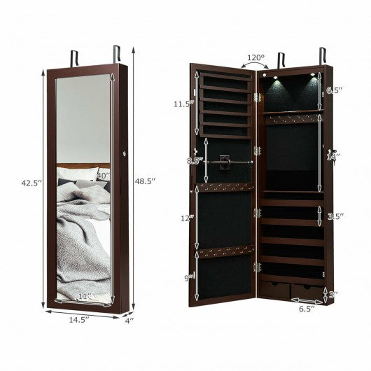 Lockable Wall Mount Mirrored Jewelry Cabinet with LED Lights-Brown
