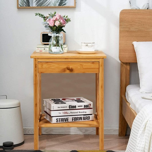Multipurpose Bamboo End Table with Drawer and Storage Shelf for Living Room-Natural