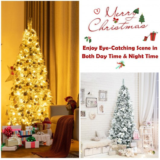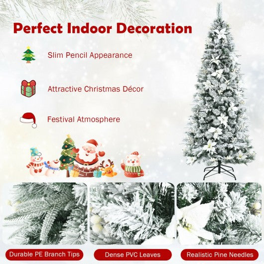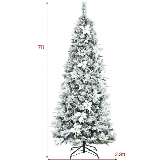 Pre-lit Snow Flocked Christmas Tree with Berries and Poinsettia Flowers-7'