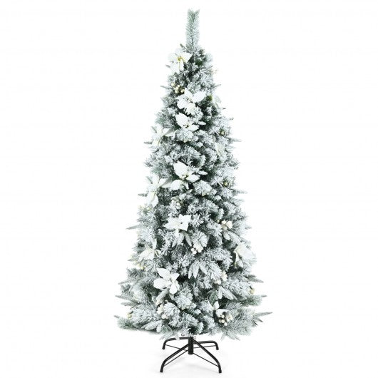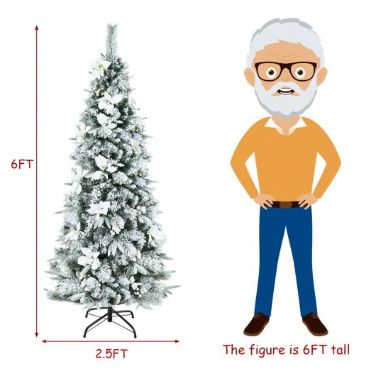 Snow Flocked Christmas Pencil Tree with Berries and Poinsettia Flowers-6 ft
